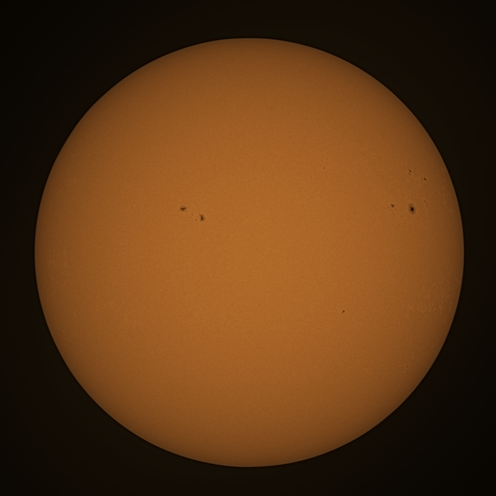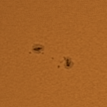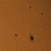 A capture and stack of 500 frames of the sun today. There are two major groupings of spots. I like how the grouping in the upper right has three distinct levels or shades of penumbra. This is less noticeable in the group in the lower right image.