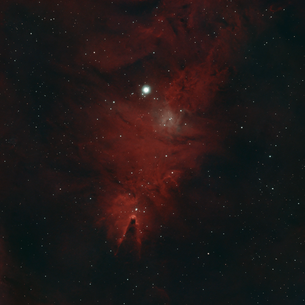 The cluster and nebulae are located in the constellation of Monoceros and are about 2600 lightyears from us. The bright star is S Monoceros and is the “star” on the top of the tree. To be honest I have trouble seeing the tree, but I think it is the lighter OIIII signal in the image.