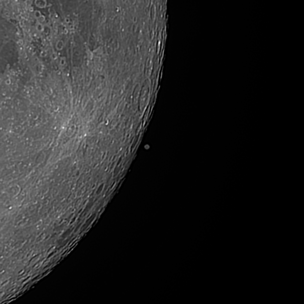 I hung in and finally got the moon centered in the field of view as it rose above the observatory’s wall. I focused and switched the mount over to “lunar” tracking just in time to see Mars approaching the limb of the moon. Great, I was ready….and then the clouds crept over the Moon and totally obscured the ingress event. So, I waited for the clouds to part hoping they would while Mars was still visible. As quickly as the clouds arrived, they exited just minutes or perhaps seconds after Mars had disappeared behind the Moon. Well crap, if that isn’t some bad luck. I had waited this long, so I watched for the next 55 minutes to see if the egress event was going to be possible. I held my breath as the appointed time approached and ta da, the weather gods smiled upon me, and I was able to capture the egress.