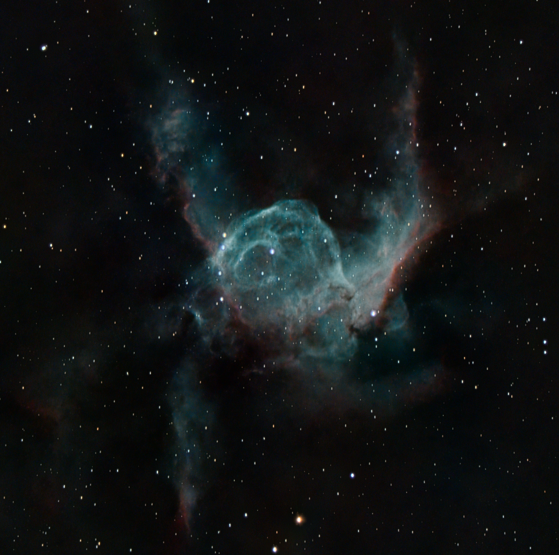 This week’s capture is that of NGC 2359, Thor’s Helmet. This is a beautiful nebula in Canis Major. It comprises a central illuminated bubble-like structure attached to two prominent “wings” giving rise to its name. There is however much more to this superhero’s headgear when we start to peel back its layers.