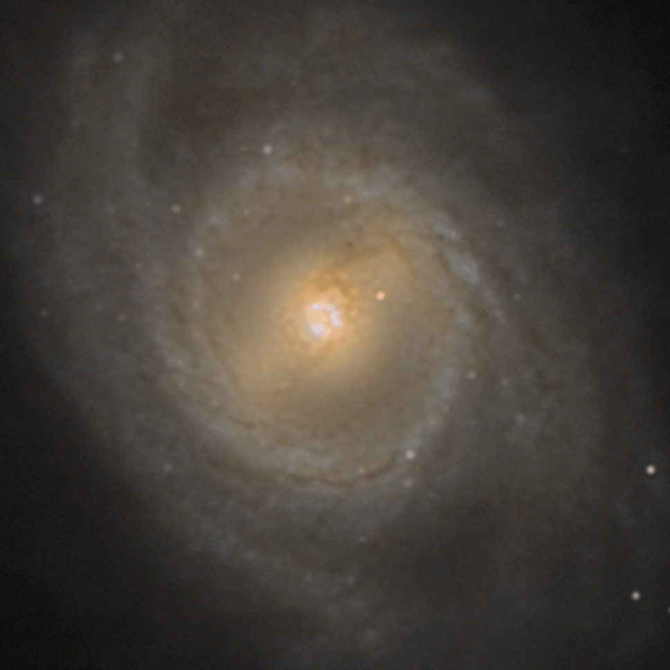 Messier 95 appears to us as nearly face on, displaying beautiful spiral arms and a central bar across the nucleus. The spiral arms form a ring-like structure, enclosing the bar. The galaxy is classified as a type SB(r)b. S-for the spiral. B for the bar. (r) for the ring and b for the intermediate tightness of the spiral arms.