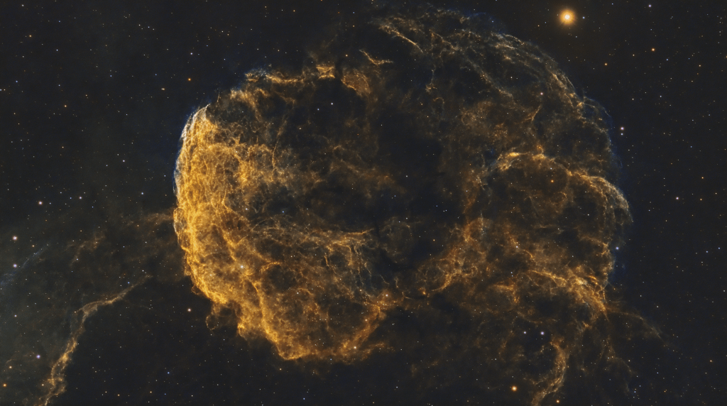 Sh2-248 is the Jellyfish Nebula, a supernova remnant in Gemini. Visually it’s a lacy web of shock-heated filaments: strong Hα arcs and lots of O III structure that can give it that teal/blue “glow” in narrowband. It sits near the bright star η Geminorum (Propus), and spans roughly ~45–50 arcminutes (bigger than the full Moon). It’s about ~5,000 light-years away and is a well-studied example of an SNR interacting with surrounding molecular clouds.