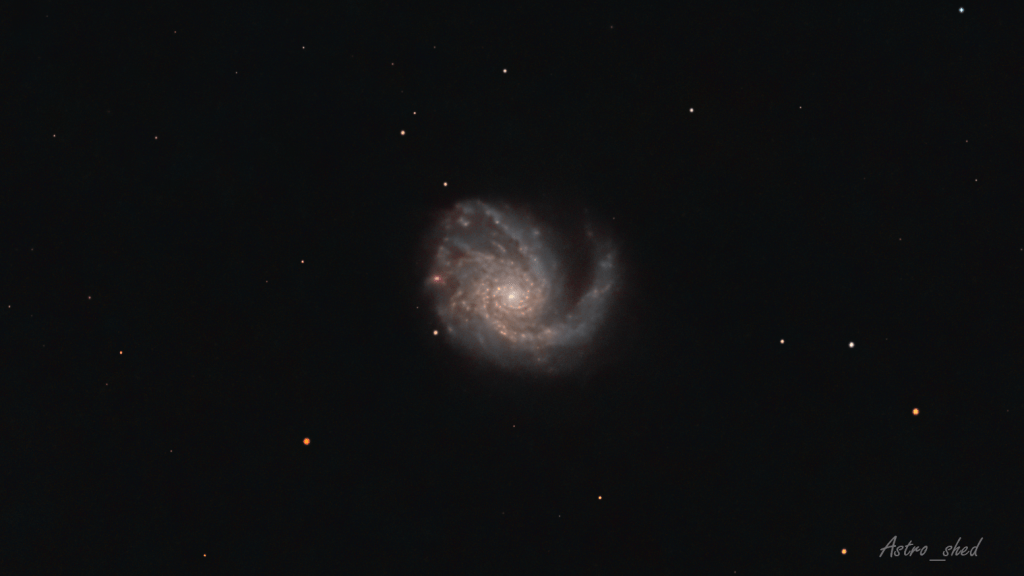 Messier 99’s more face-on tilt shows off its beautiful arms and in particular the one heavy arm to the right which is more extended than the others. This is an indication that Messier 99 has undergone a gravitational event with another galaxy at some point in its history. The red color in the arms are HII regions where new stars are being formed. While not considered a Starburst galaxy, the stellar formation activity within this galaxy is several times higher than that of similar galaxies.