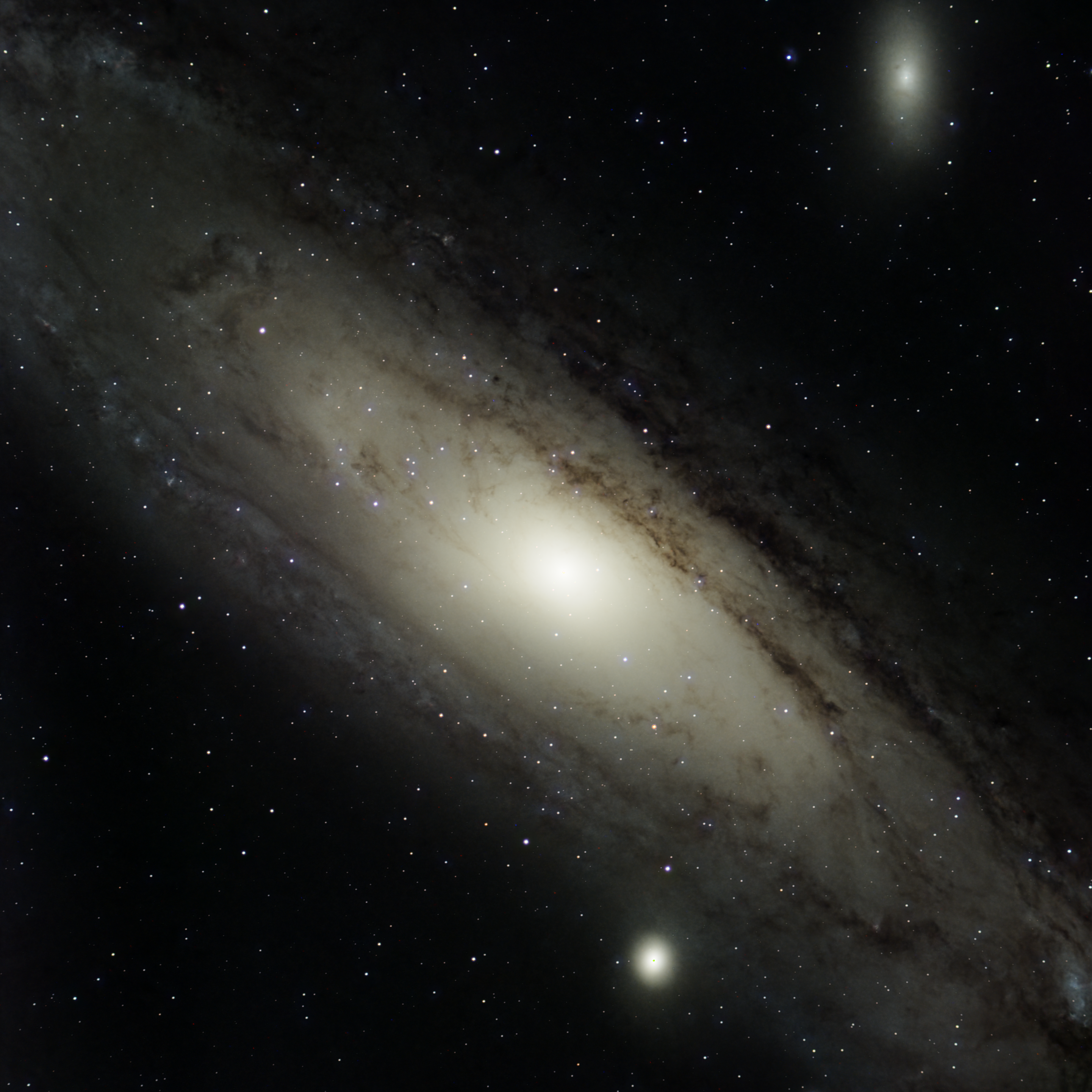 The image at the top left is the Andromeda galaxy, a beautiful spiral galaxy with two elliptical companion galaxies. Spiral galaxies tend to be rather flat. The bottom three images show spirals at different viewing angles making a wonderful variety for imaging. The edge on galaxy at the lower right is displaying a dark dust lane bisecting its disk, not unlike the one in our own Milkyway galaxy.