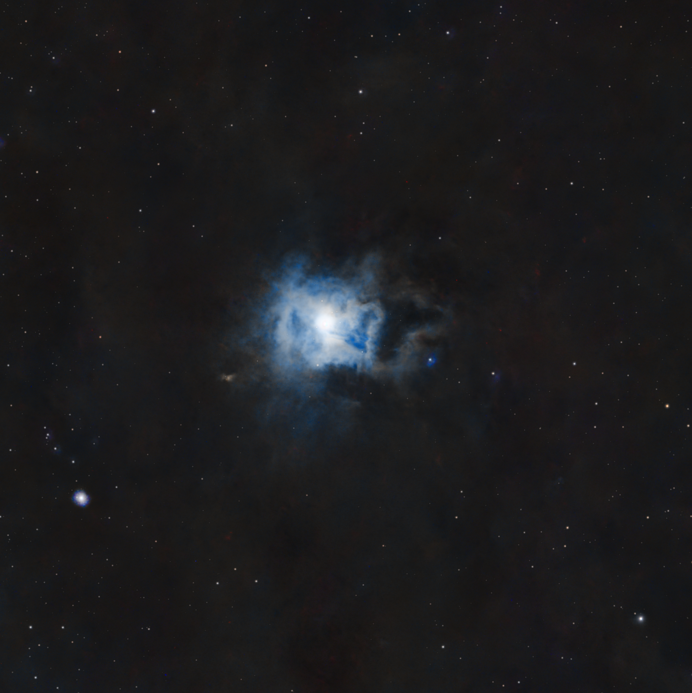 Lower right is the Iris reflection nebula. The blue reflected light is coming from a hot blue giant star in the center of the nebula.