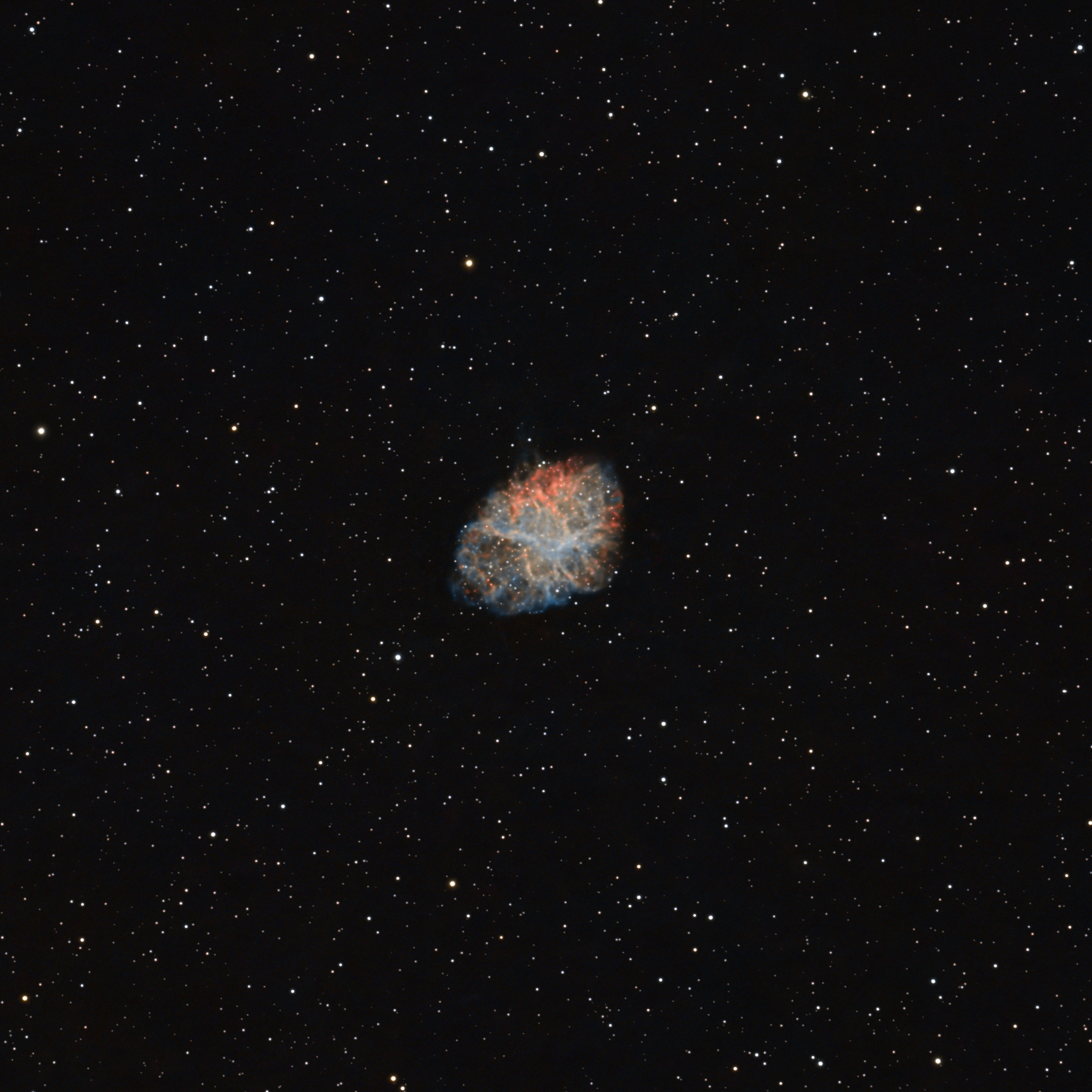 Middle right is the Crab Nebula in Taurus. It is a Supernova remanent which was created when a massive star exploded, forming a highly energetic, but tiny neutron star. The filaments are formed as the expanding gasses are slamming into interstellar matter (bow shocks) which causes the gas to compress. As a gas compresses, it also heats up and, in this case, it heats enough to cause it to ionize, giving off the light we see here.